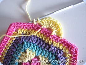 Jeg har kun heklet en omgang med hver farge. Når jeg er ferdig med en farge klipper jeg alltid tråden før jeg begynner med nye farge.
