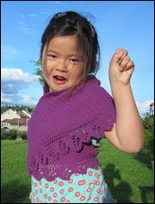 Har set på dette mønster flere ganger, fint. En nydelig lillafarge på garnet du brukt. Go`jenta di er nydelig!