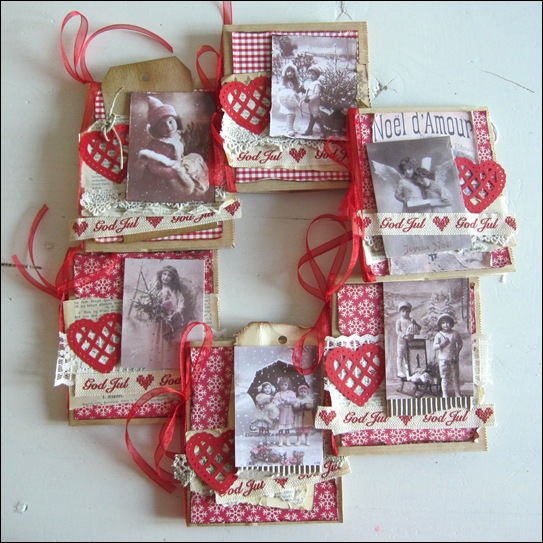 Kortene er laget av papirposer som jeg har kjøpt på Panduro, vintagebilder som jeg har skrevet ut på printeren, røde juleark med mønster, sider fra en gammel bibel, bølgepapp, blonder, rødt bånd, bånd med “God Jul” og utstansede røde hjerter. De røde hjertene er laget av en “Martha Stewart punch”.